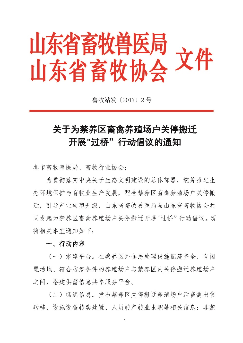 关于为禁养区畜禽养殖场户关停搬迁 开展"过桥”行动倡议的通知(鲁牧站发〔2017〕2 号)
